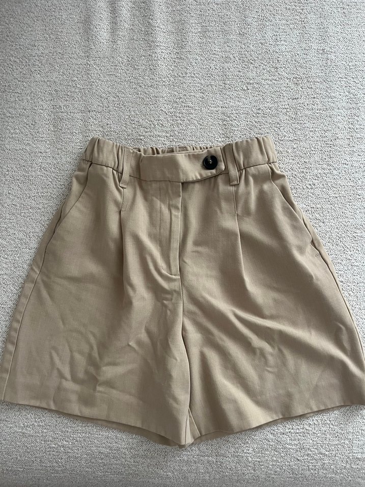 Bej renkli, keten kumaştan, yüksek bel, bol kesim ve mini boy şort, günlük rahat kullanım için uygundur.