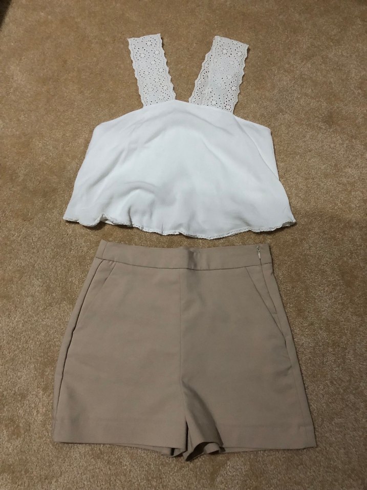 Pamuklu kumaştan yapılmış, bej renkli, yüksek bel, mini uzunlukta ve normal kesim kadın şort. Günlük kullanıma uygun, minimal tasarım.
