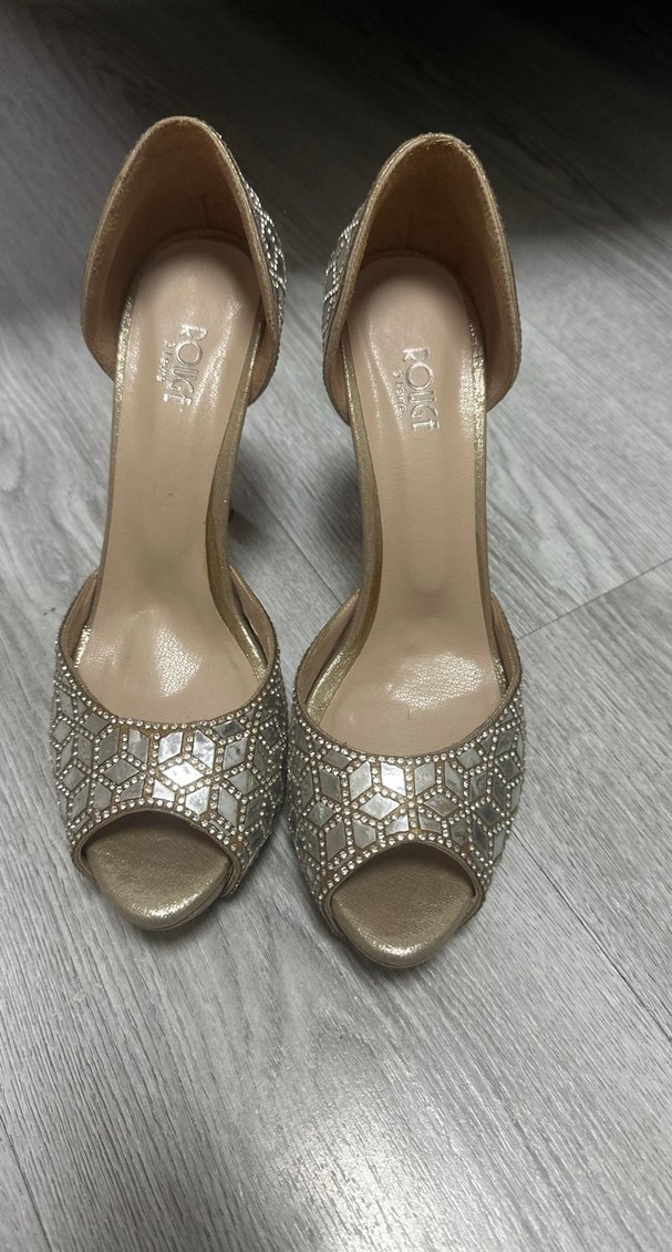 Bej renkli, payetli ve parlak yılan desenli yüksek topuklu abiye ayakkabılar, klasik zarafet ve çağdaş stili bir araya getirir. Düğünler için uygundur.