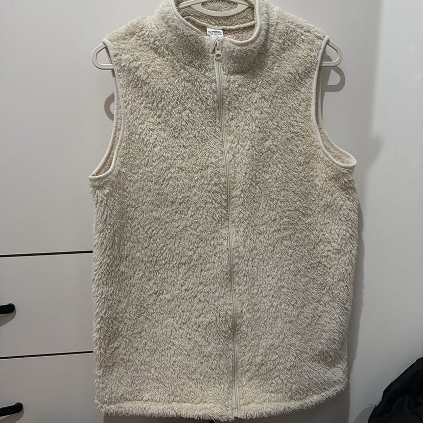 Bej renkli, yüksek yakalı ve kürk detaylı yumuşak dokulu, günlük kullanıma uygun, vücuda oturan kolsuz yelek.