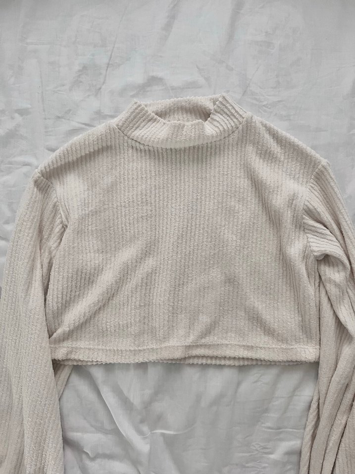 Bej renk, yüksek yaka ve uzun kollu, yumuşak keten kumaştan örülmüş, vücuda oturan normal uzunlukta kadın kazak. Günlük kullanıma uygundur.
