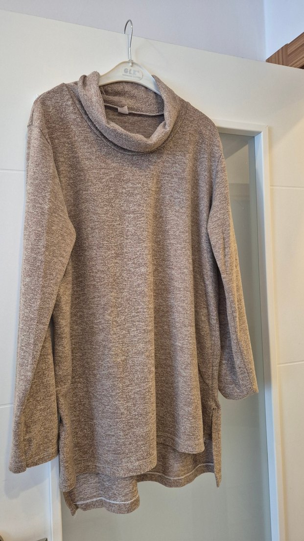 Bej renkte, yüksek yakalı ve uzun kollu kadın triko kazak. Yumuşak keten kumaştan, bol kesim ve normal boyda, rahat günlük kullanım için uygun. Örgü dokusu sıcaklık katar.