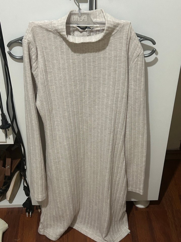 Bej renkte, yüksek yaka, uzun kollu ve midi boyda triko kadın elbisesi. Yumuşak keten örgü kumaştan, günlük rahat kullanıma uygun.