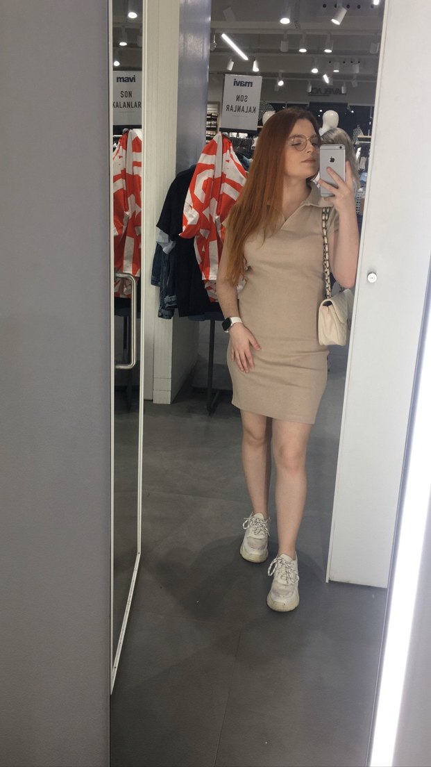 Bej Yüksek Yakalı elbise günlük şık