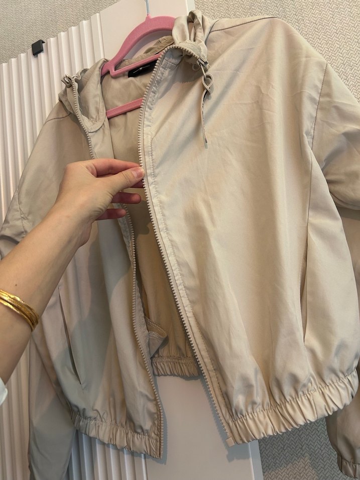 Bej renkli, yüksek yakalı ve fermuarlı kadın ceket. Uzun kollu, dar kesimli ve sentetik kumaştan üretilmiştir. Günlük ve sokak stili için uygundur.