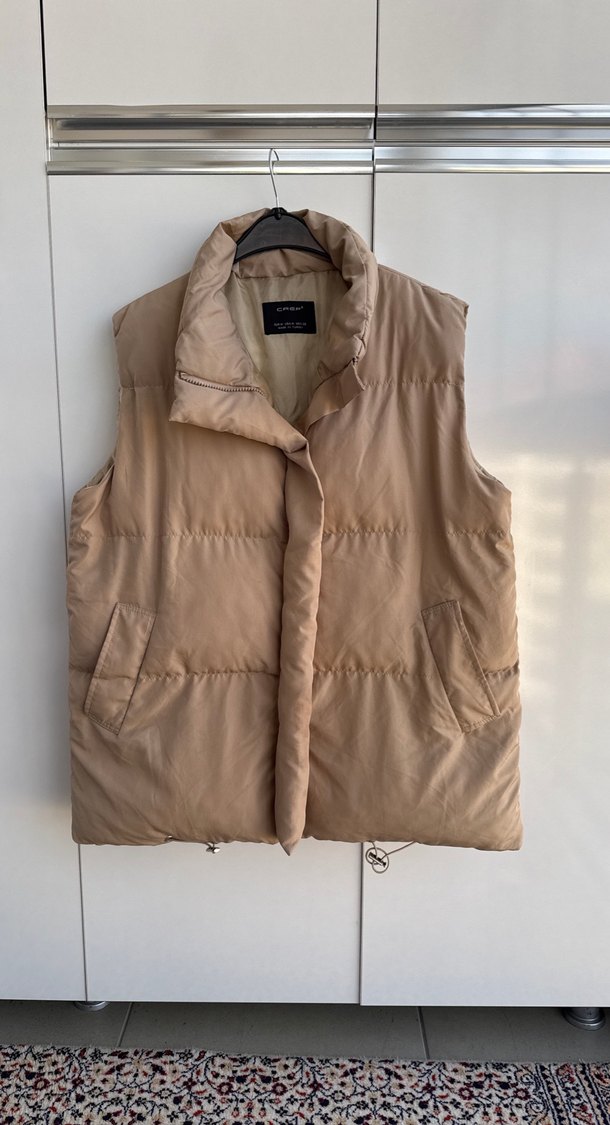 Bej, yüksek yakalı ve fermuarlı, yumuşak doku kadın yelek. Rahat kesim ve normal midi boyda, günlük sokak stili için uygun. Boy 70 en 56