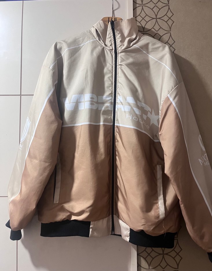 Bej renkli, yüksek yakalı ve fermuarlı oversize ince yağmurluk Uzun kollu, bol kesim ve midi boyda. Sentetik kumaştan, günlük ve sokak stiline uygun. Sadece bir kez giyilmiştir