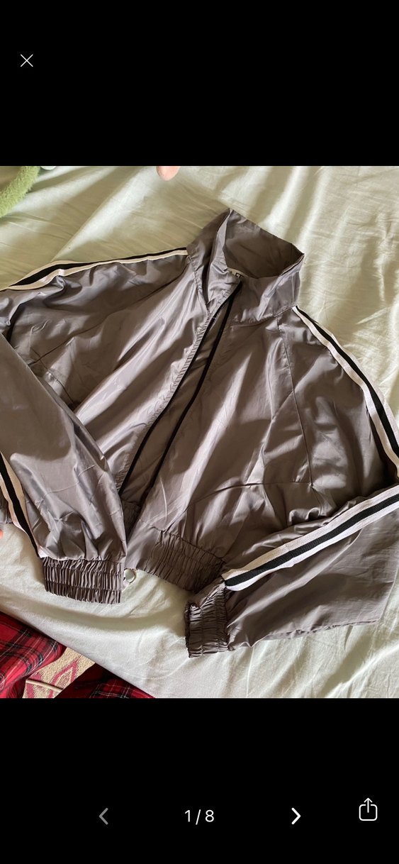 Bej renkte, yüksek yakalı ve fermuarlı spor ceket. Sentetik kumaştan, bol kesim ve kollarında şerit detaylıdır. Günlük kullanıma uygundur.