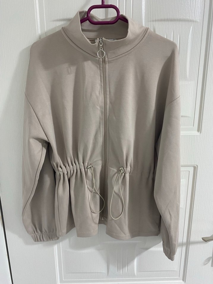 Bej renkli, yüksek yakalı ve fermuarlı, bol kesim sweatshirt. Ayarlanabilir bel bağcıkları ve uzun kollara sahip, yumuşak ve sıcak dokulu kumaştan yapılmıştır.