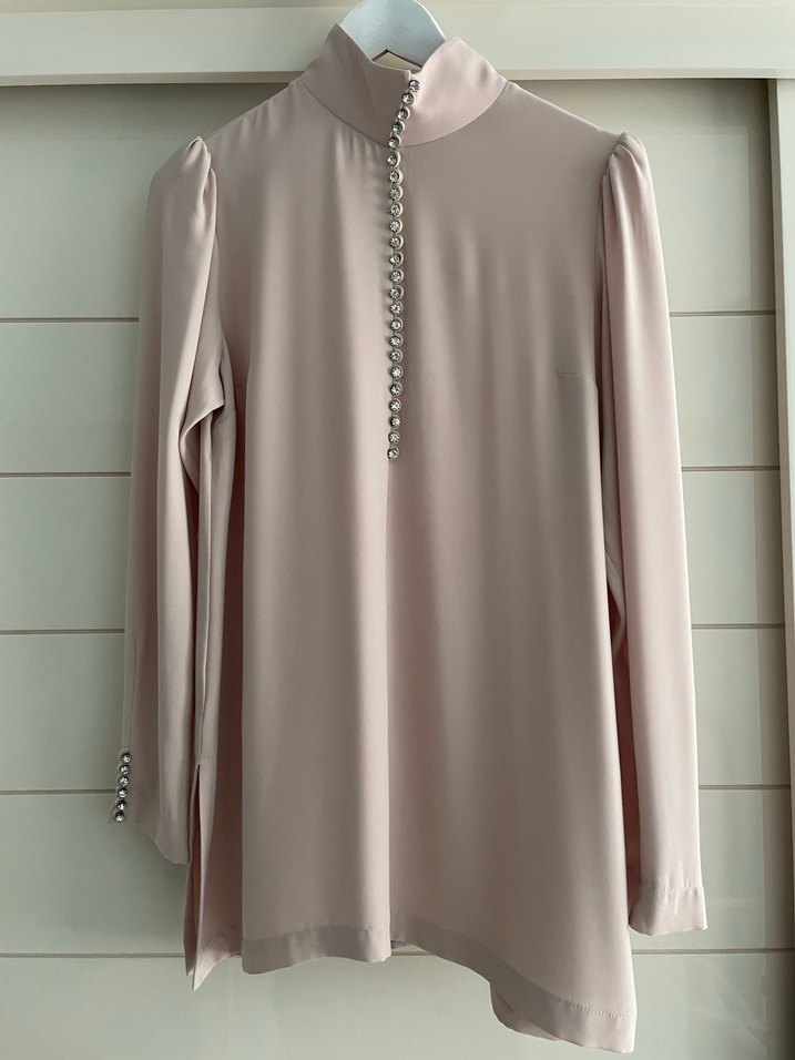 Bej renkli, yüksek yakalı ve uzun kollu kadın gömlek taşlı senna marka tarakçılardan alındı