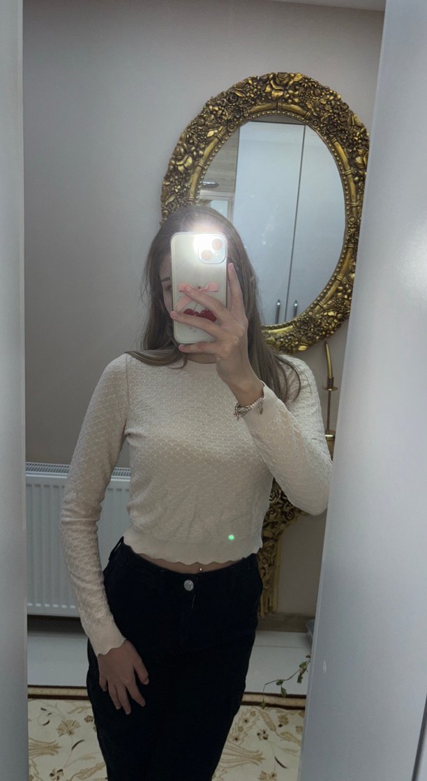 Bej renkli, yüksek yakalı ve uzun kollu ince triko kumaştan yapılmış, vücuda oturan midi uzunluğunda kadın kazak. Minimalist ve şeffaf detaylarıyla gündelik şıklık sunar.