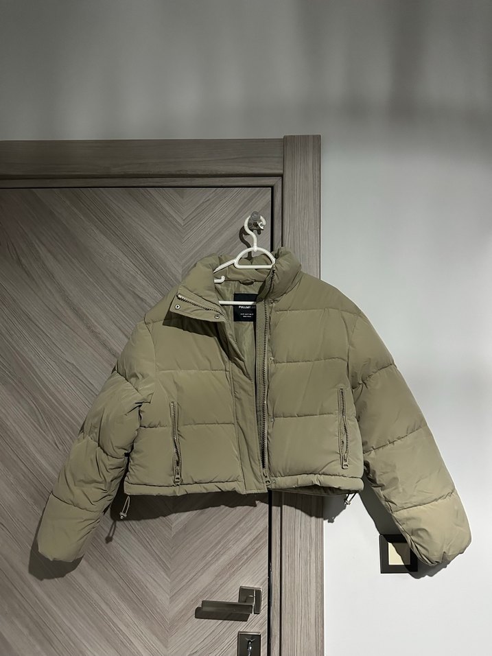 Bej renkte, yüksek yakalı ve uzun kollu kadın kışlık mont. Yumuşak, sıcak kumaştan ve fermuarlı ceplerle rahat bir midi boy tasarım.