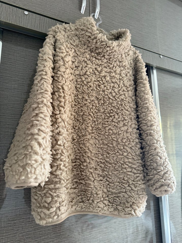 Bej renkli, yüksek yakalı ve uzun kollu kadın peluş sweatshirt. Rahat kesimi ve midi boyu ile gündelik kullanıma uygundur.