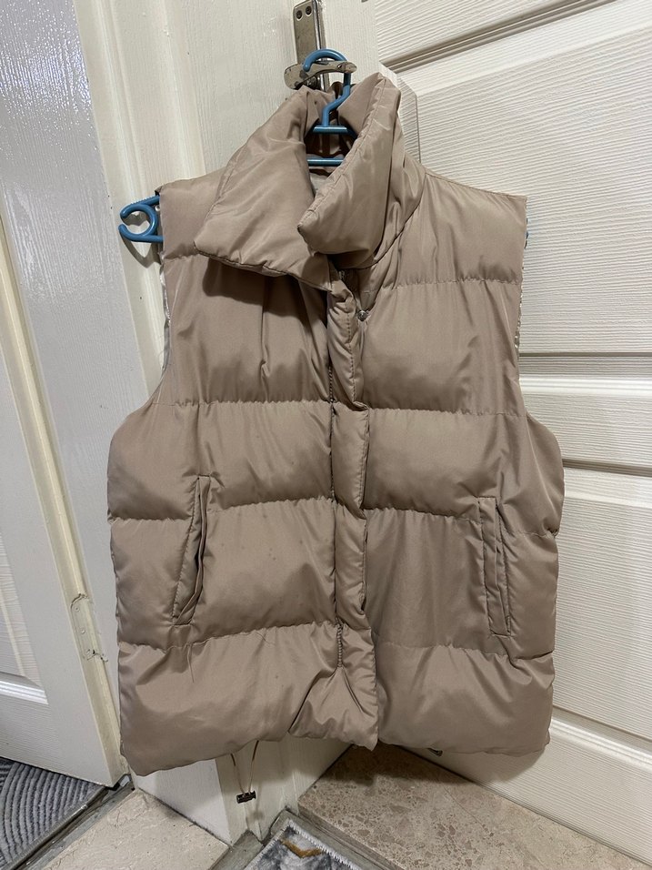 Yüksek yakalı, kemerli bej şişme yelek. Sentetik kumaştan, günlük kullanıma uygun, rahat ve dar kesim tarzda. Su lekesi var yıkanınca çıkar. Marka temsili.