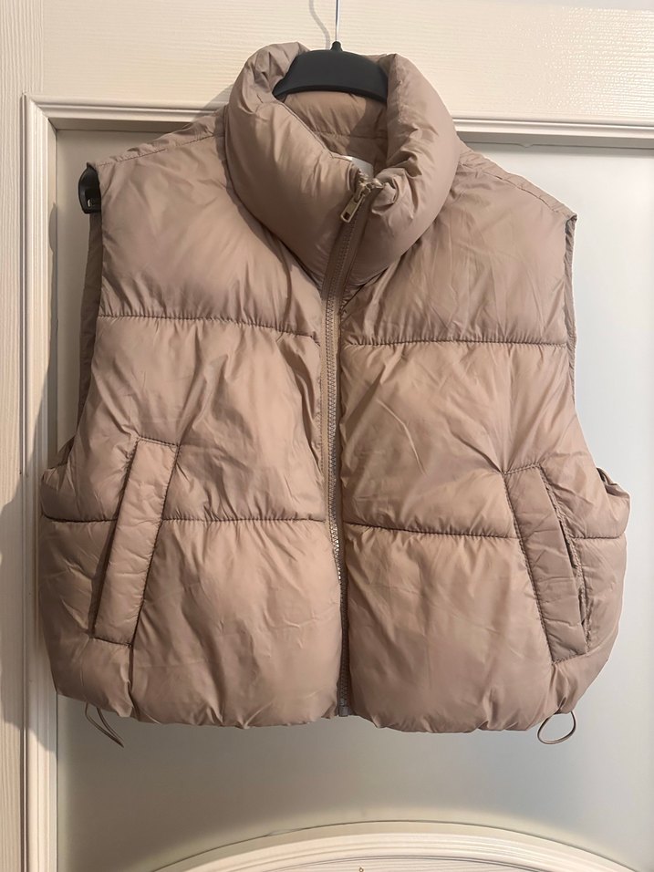 Yüksek yakalı, fermuarlı, bej renkte, bol kesim ve yumuşak dokulu kolsuz kadın yelek. Rahat günlük kullanım için uygundur.