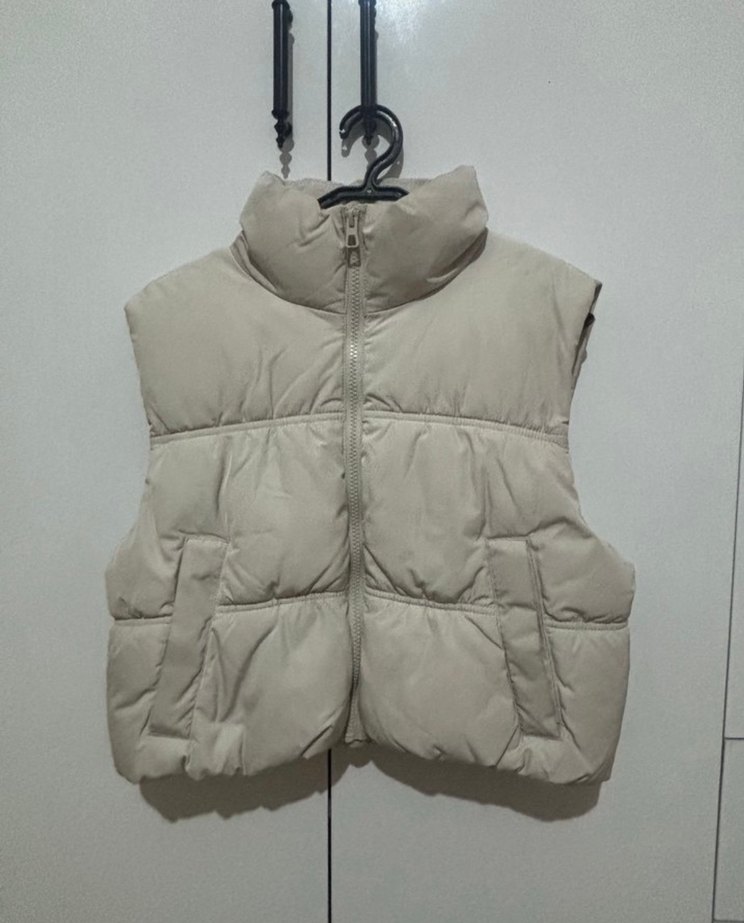 Bej renkte, yüksek yakalı, kolsuz ve normal boyda şişme kadın yeleği. Yumuşak ve sıcak kumaştan, rahat ve şık bir dış giyim parçası.