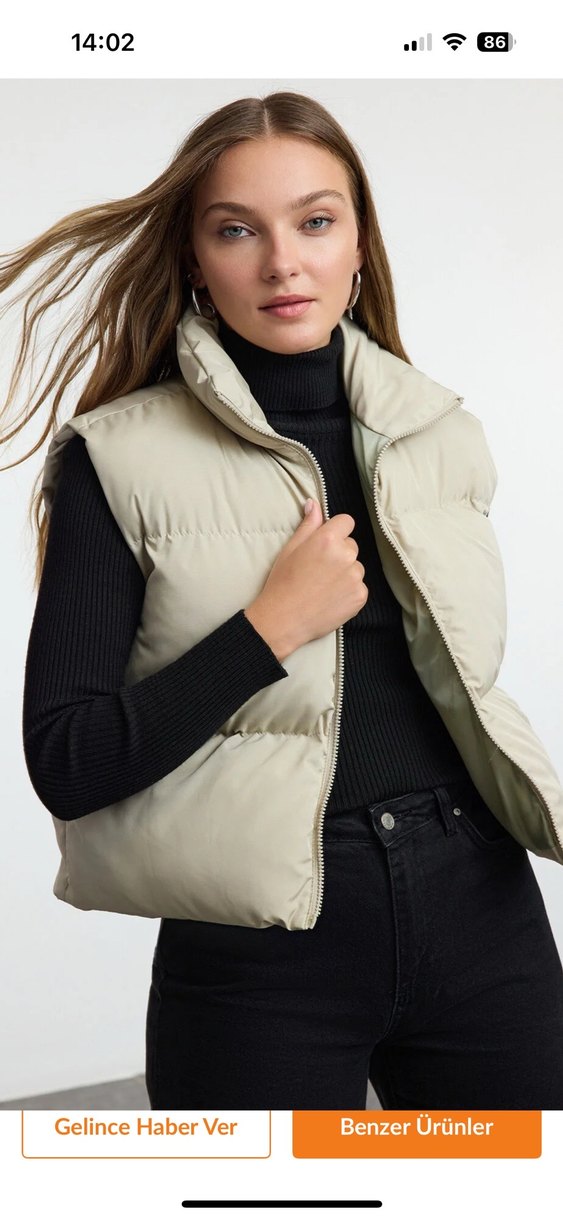 Bej renkte, yüksek yakalı, kolsuz ve vücuda oturan kadın şişme yelek. Yumuşak sentetik kumaştan, günlük sokak stiline uygun normal boyda. Desensiz, zahmetsiz şıklık sunar.