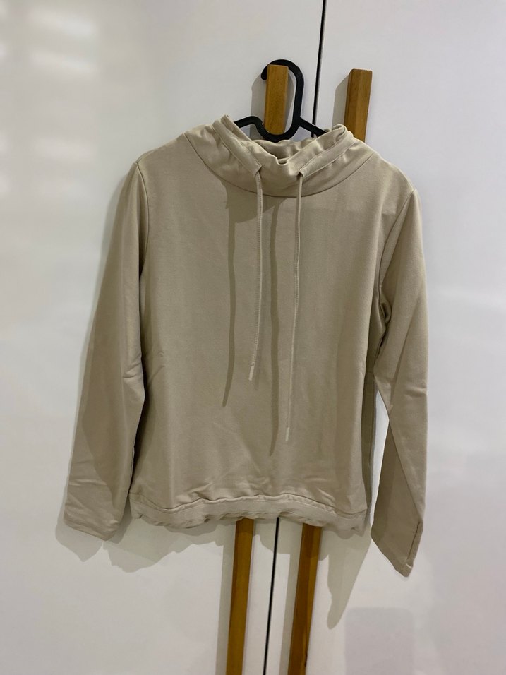 Bej renkte, yüksek yakalı ve uzun kollu kadın sweatshirtü. Yumuşak keten kumaştan, bol kesim ve normal boyda. Günlük rahat sokak stiline uygun, desensiz ve şık görünümlü.