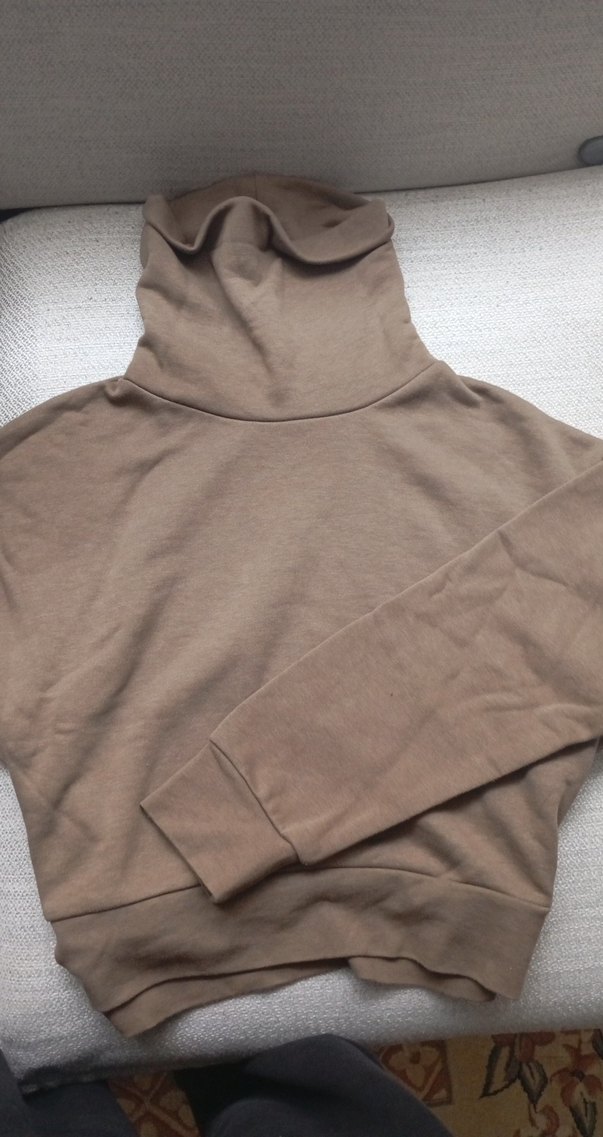 Bej renkli, yüksek yakalı ve uzun kollu kadın sweatshirtü. Yumuşak keten kumaştan, bol kesim ve normal boyda. Günlük kullanıma uygun sade ve rahat bir parça.