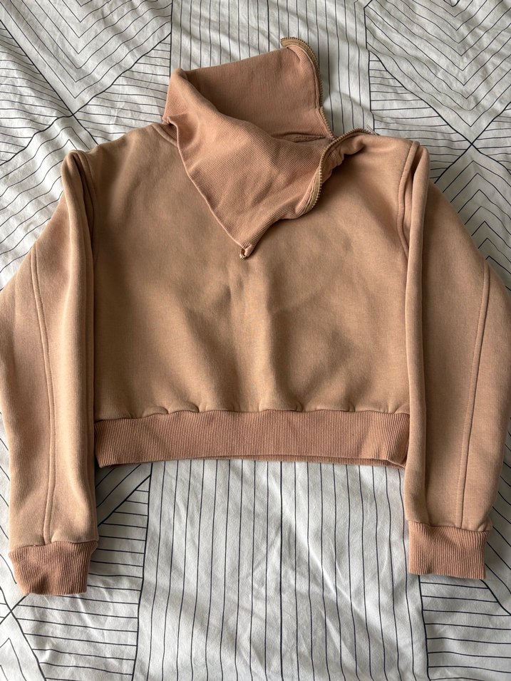 Bej pastel renkte, yüksek yakalı ve fermuarlı kadın sweatshirt. Uzun kollu, rahat kesim ve yumuşak keten kumaştan, günlük ve sokak stili için uygun.