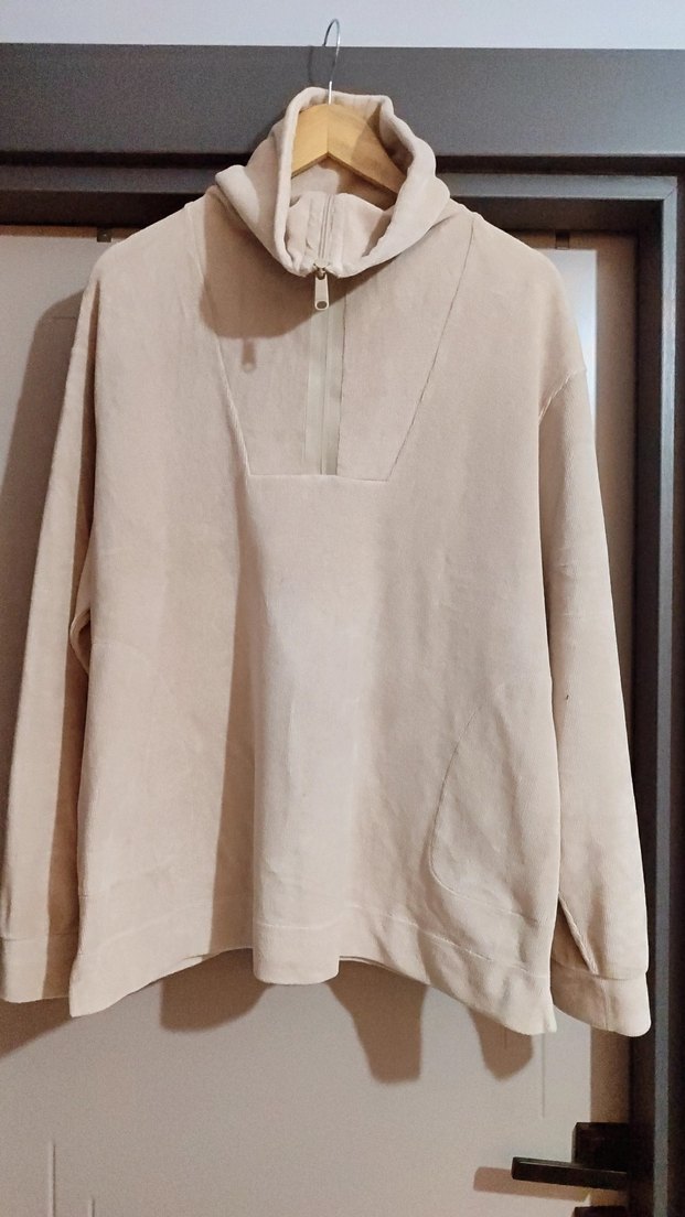 Bej renkli, yüksek yakalı, uzun kollu, bol kesim kadın sweatshirt. Yumuşak ve sıcak kadife kumaştan, günlük kullanıma uygun rahat ve şık bir parça. beden etiketi kesik 42/44 uyumludur