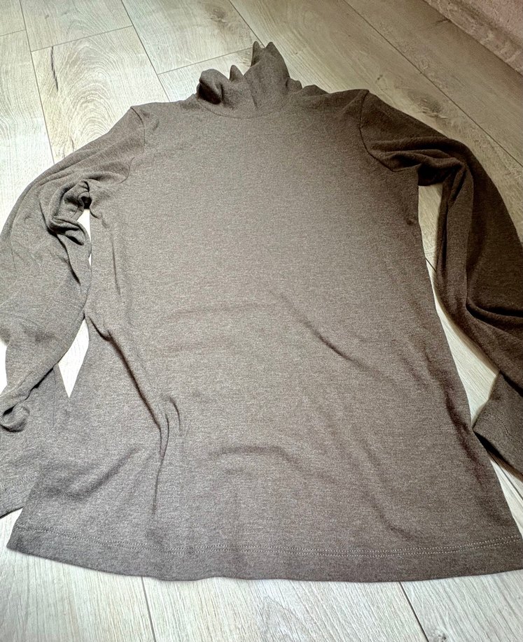 Bej renkte, yüksek yakalı ve uzun kollu, yumuşak keten kumaştan yapılmış, düz ve vücuda oturan kadın kazağıdır.