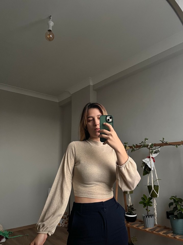 Bej renkli, yüksek yakalı ve uzun kollu, iç gösterir bluz. Rahat kesimli ve midi boyda, minimal ve zahmetsiz şıklık sunar.
