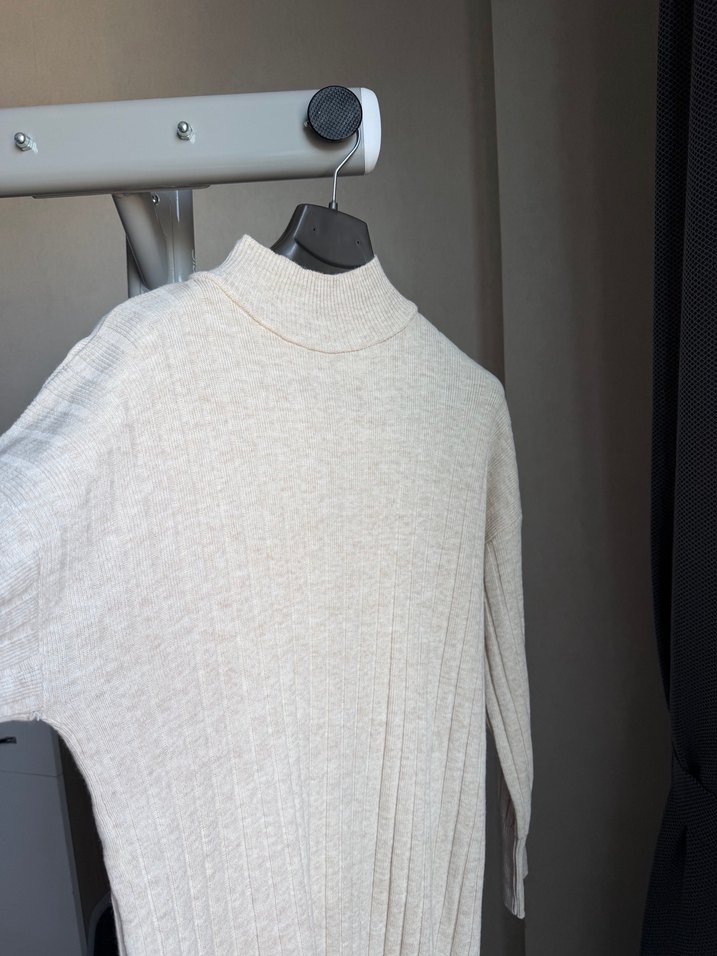 Bej renkli, yüksek yakalı ve uzun kollu kadın triko elbiseYumuşak keten kumaştan, normal kesim ve midi boyda. Günlük kullanıma uygun, desen içermeyen rahat tasarım.