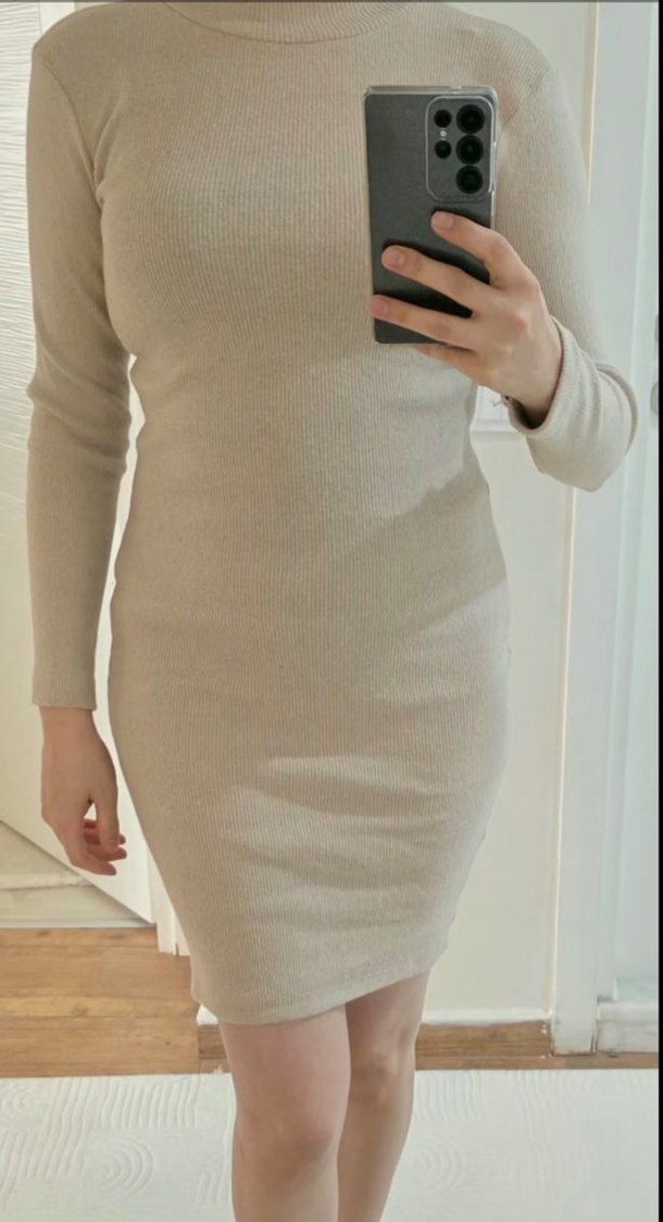 Bej renkte, yüksek yakalı ve uzun kollu, vücuda oturan mini boy triko elbise. Yumuşak kumaştan yapılmış, rahat ve şık bir tasarıma sahiptir. m,l beden uyumlu sorunsuz temiz