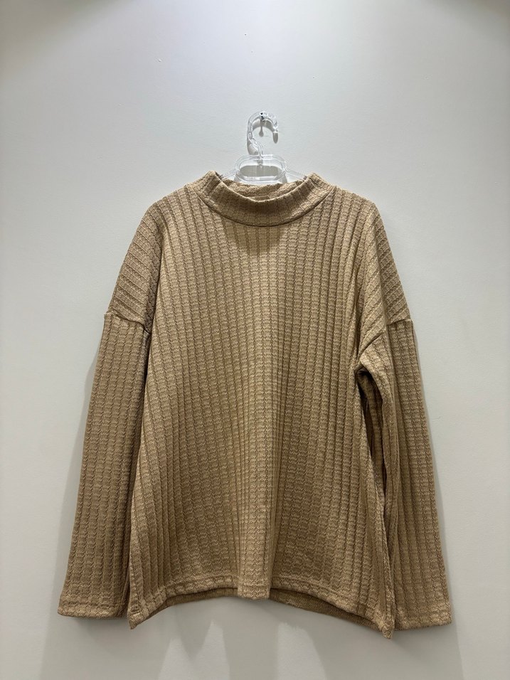 Bej renkli, yüksek yakalı ve uzun kollu örme triko kazak, rahat ve bol kesimiyle günlük kullanıma uygundur.