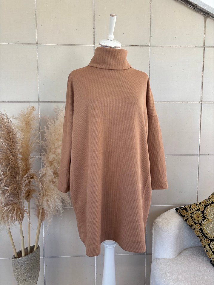 Bej renkli, yüksek yakalı ve uzun kollu kadın triko kazak Rahat kalıp ve yumuşak, sıcak kumaş ile günlük kullanıma uygundur.