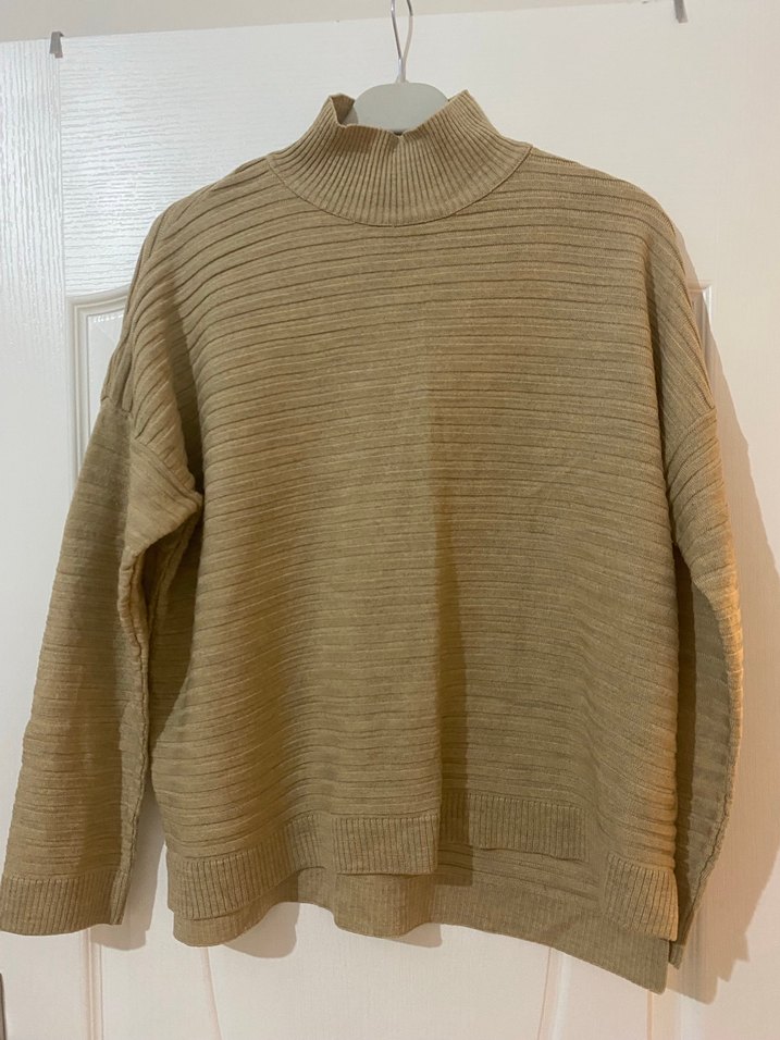 Bej renkli, yüksek yakalı ve uzun kollu, yumuşak keten kumaştan örülmüş, bol ve normal boyda kadın kazak. Rahat ve trend görünüme uygundur.