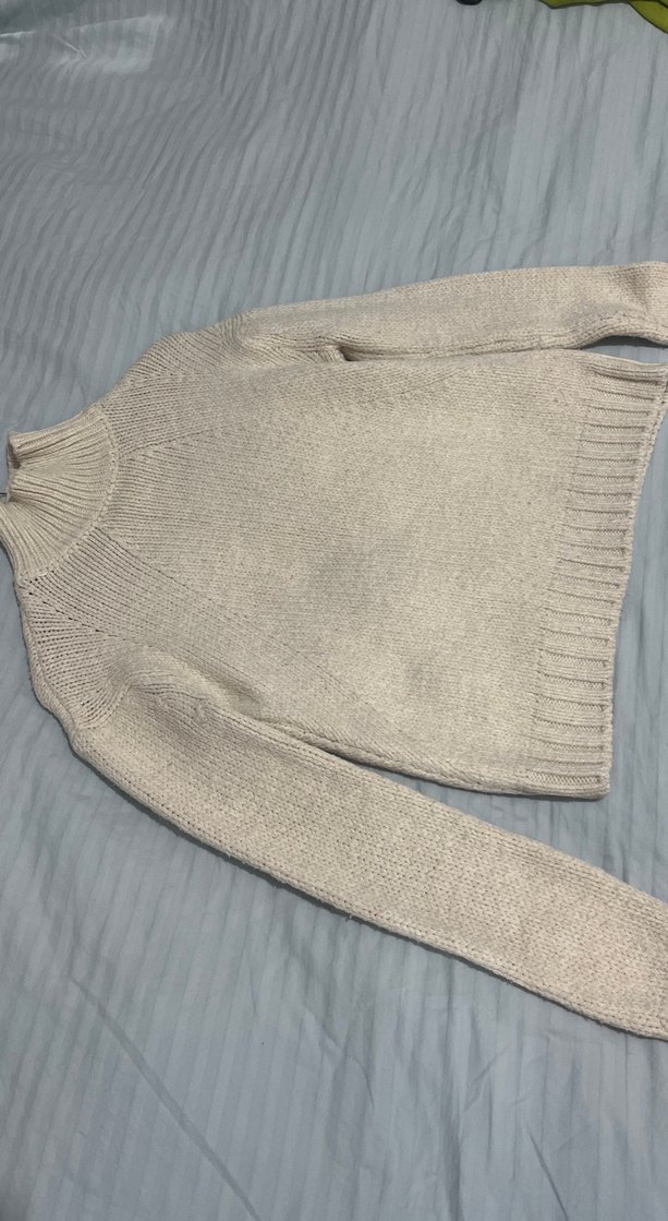 Bej renkte, yüksek yakalı ve uzun kollu örme kadın kazak. Rahat ve sade tasarımıyla günlük kullanıma uygundur.