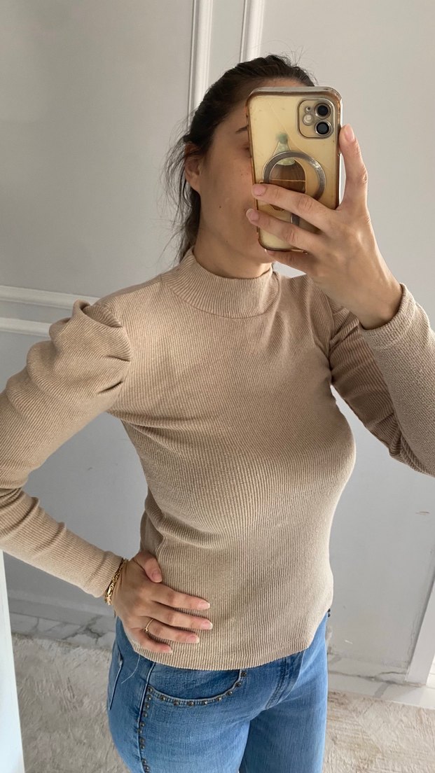 Bej renkli, yüksek yakalı ve uzun kollu triko kazak, vücuda oturan yapısıyla günlük kullanıma uygundur. Düz ve sade tasarıma sahiptir.