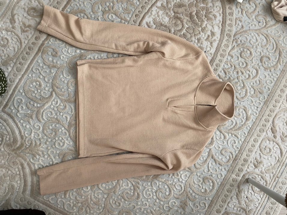 Bej renkte, uzun kollu ve yüksek yakalı triko kazak, rahat ve şık sokak stiline uygun günlük kullanım için ideal.