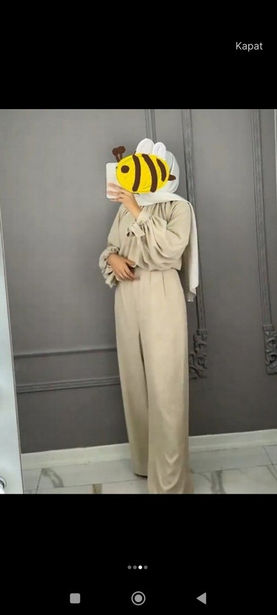 Bej renkte, yüksek yakalı ve uzun kollu kadın tulumu. Sentetik yumuşak kumaştan, bol kesim ve minimalist tasarım ile günlük kullanıma uygun.