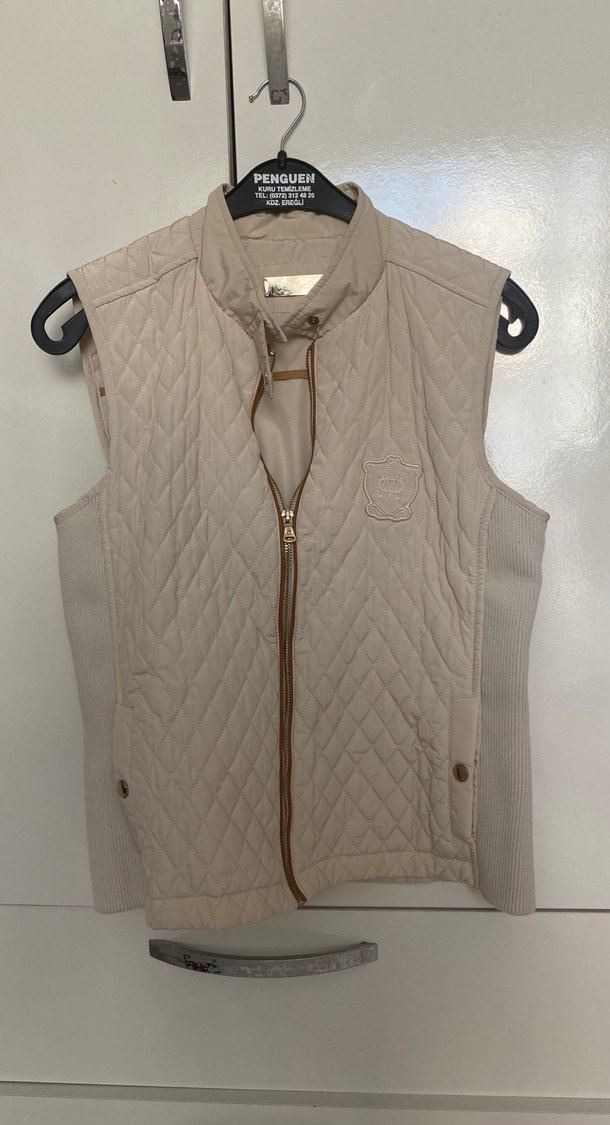 Bej renkte, yüksek yakalı ve fermuarlı ön kapamalı, yumuşak sentetik kumaştan kadın yelek. Normal kesim ve günlük kullanıma uygun.