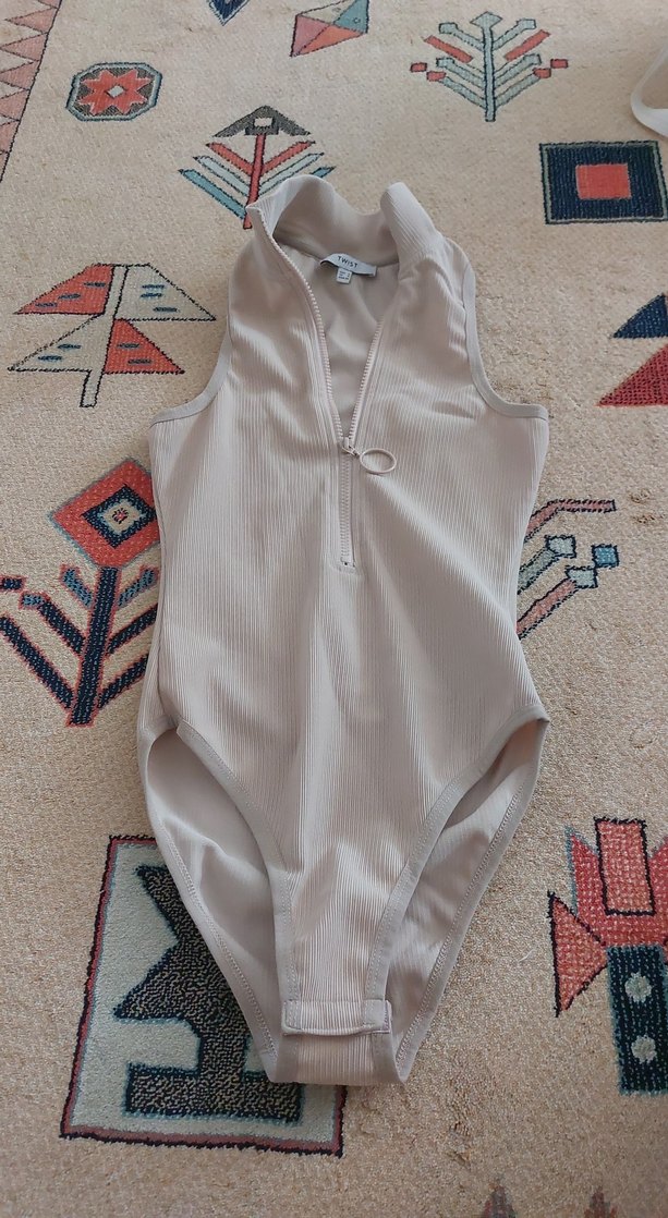 yüksek yakalı ve ön fermuarlı bej renkli kolsuz, vücuda oturan bodysuit. Midi boy tasarım.
