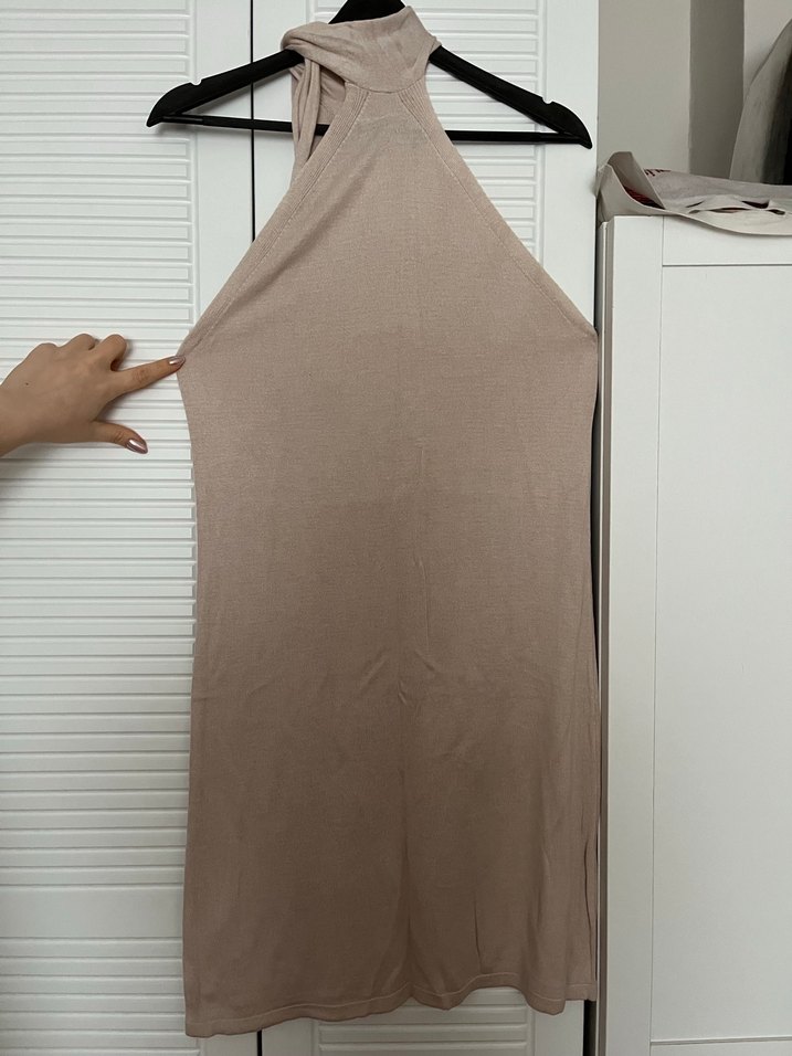 Bej renkli, yüksek yakalı ve kolsuz, drapeli detaylı ince ve parlak kumaştan midi elbise. Minimalist ve sade tasarımıyla günlük sokak stiline uygundur.