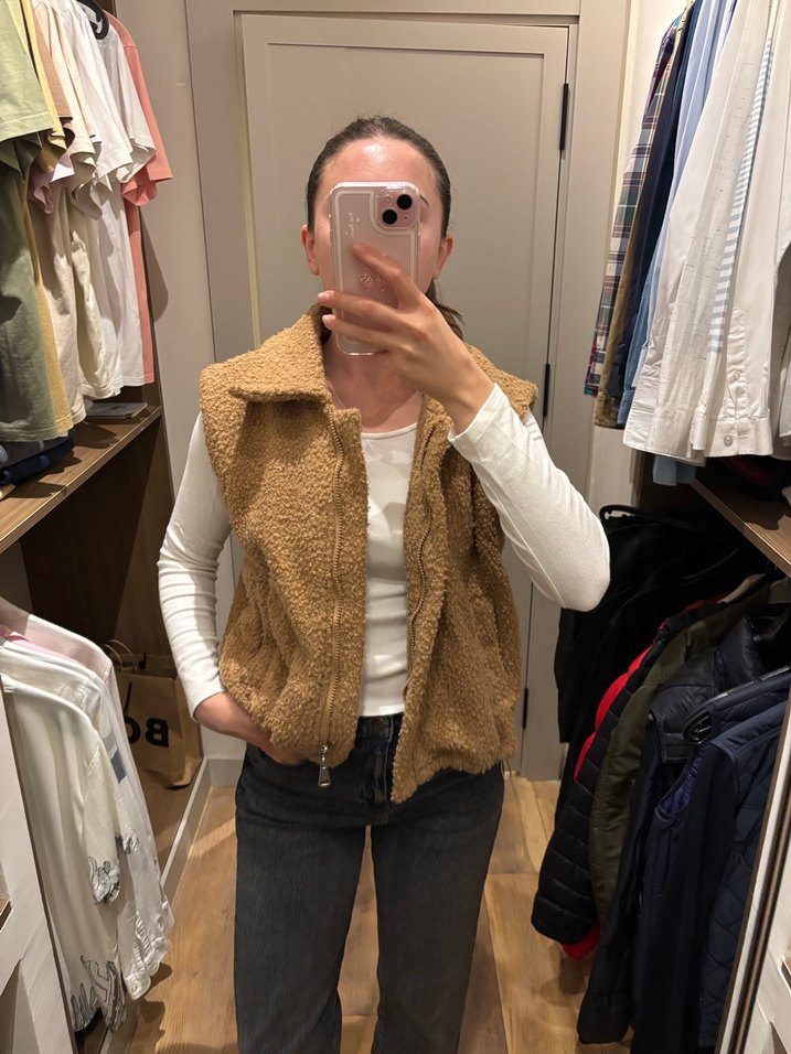 Bej renkli, yüksek yakalı ve kürklü detaylara sahip, fit kesim kadın yelek. Yumuşak ve sıcak kumaştan, günlük kullanım için uygun.