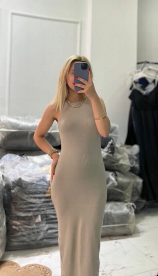 Yüksek yakalı, kolsuz, bej midi elbise. İnce yapılı, pürüzsüz sentetik kumaştan, gündelik şık tarz için ideal.