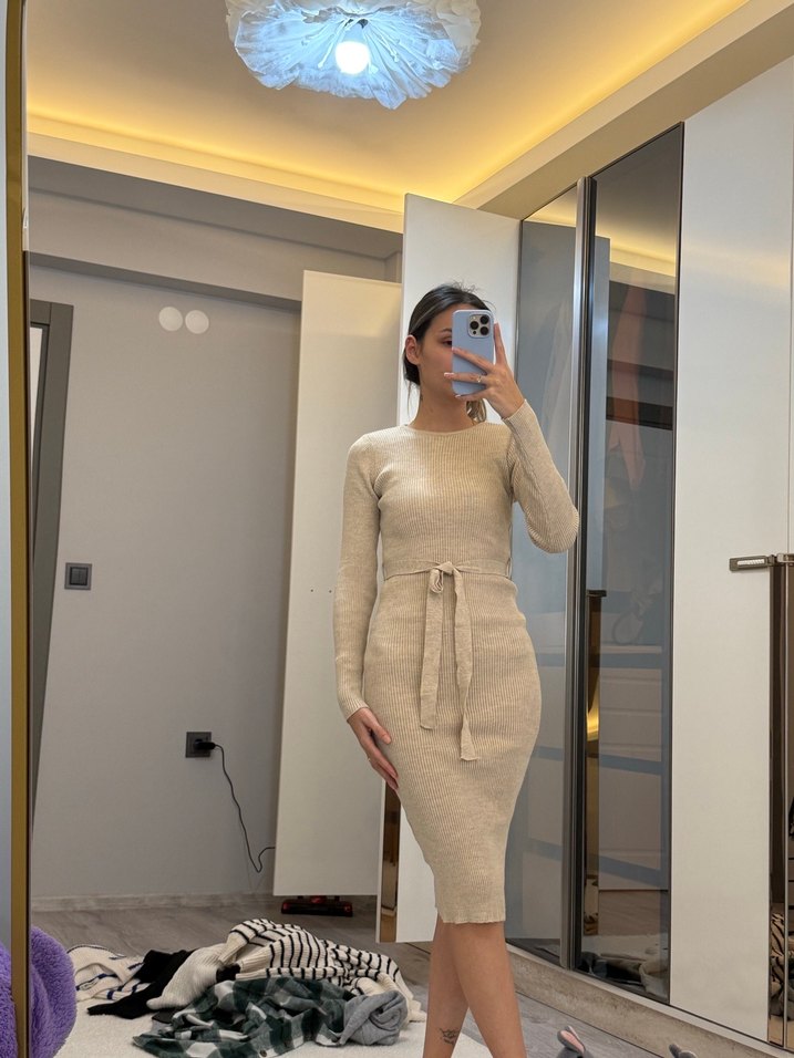 Bej renkli, yüksek yakalı ve uzun kollu midi triko elbise. İnce kumaştan, belde bağlamalı, minimal ve rahat şıklık sunar. Günlük kullanıma uygundur. S beden. Boyum 164 kilom 50