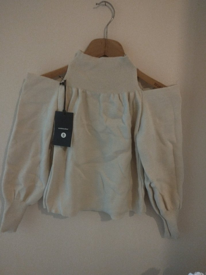 Bej renkli, uzun kollu, yüksek yakalı, örgü dokulu, kısa ve bol kesim kadın kazak. Rahat ve şık bir görünüm sunar.