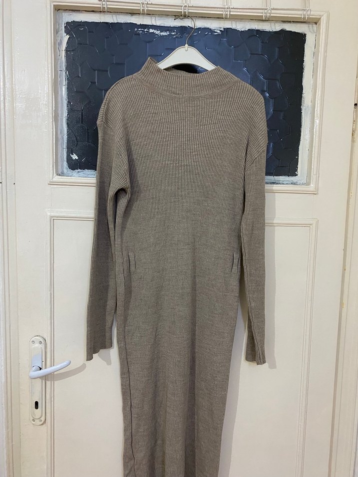 Bej tonunda, yumuşak örme kumaştan, yüksek yakalı ve uzun kollu, vücuda oturan kadın uzun elbise. Rahat ve sade normcore tarzda, günlük kullanıma uygun.