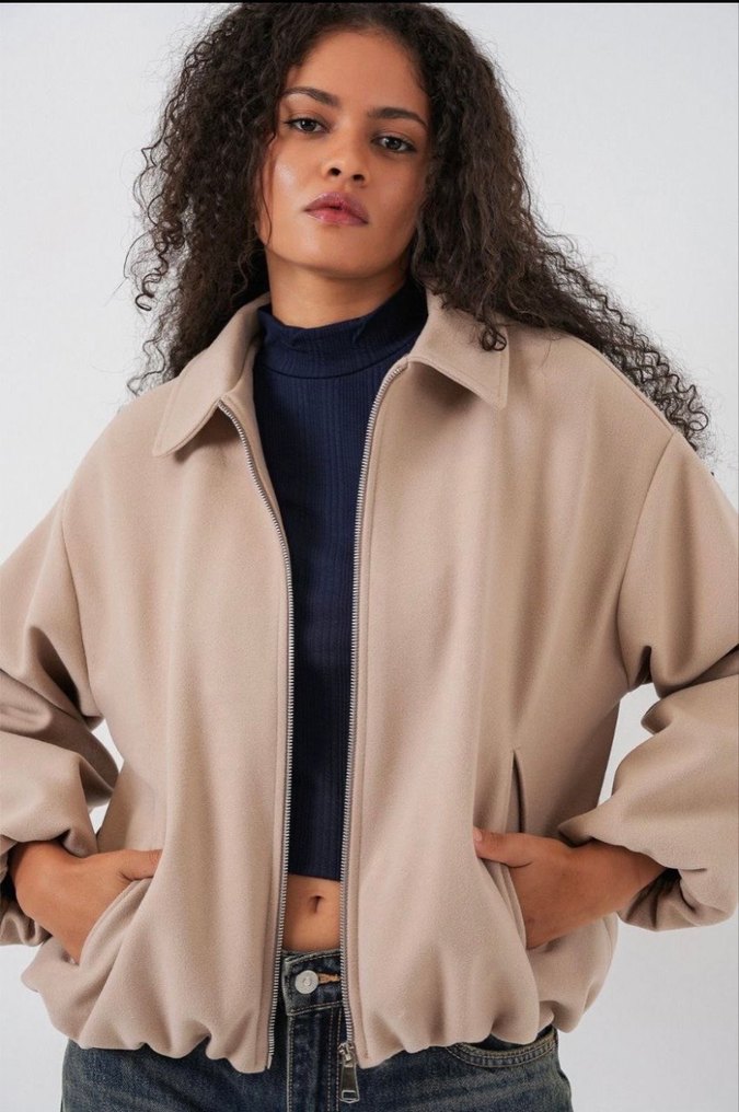 Bej Yüksek Yakalı Rahat Kesim Kadın Kaşe Ceket