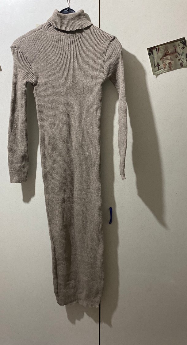 Bej renkli, uzun kollu ve yüksek yakalı triko kumaştan yapılmış, vücuda oturan kesime sahip rahat ve şık bir uzun elbise. Boy 115 cm