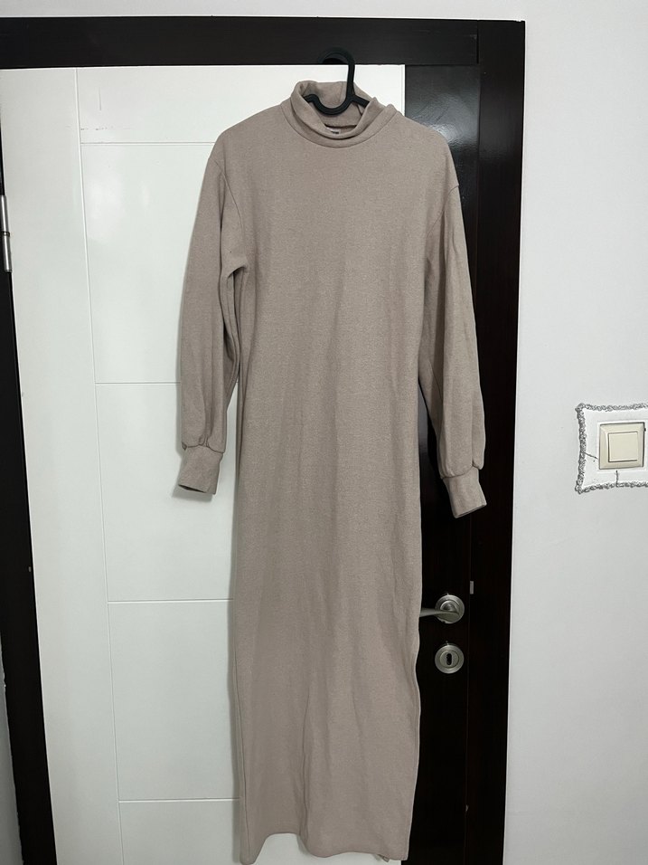 Bej renkli uzun keten elbise, yüksek yakalı ve uzun kollu. Fit kesim ve minimal tasarıma sahip, trend günlük stil için uygun.