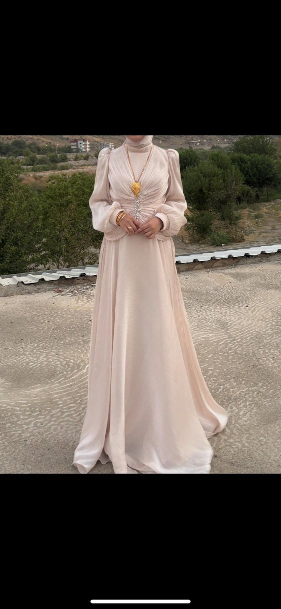 Bej renkte, yüksek yakalı, uzun kollu ve bol kesim drapeli uzun abiye elbise, düğün ve özel davetler için uygundur.
