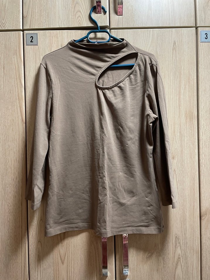 Bej renkli, yüksek yakalı ve uzun kollu kadın gömleği. Rahat kesimi ve yakadaki kesik detayıyla günlük kullanıma uygun şık bir parça.