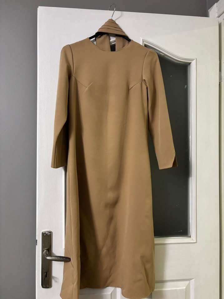 Bej renkte, parlak sentetik kumaştan yapılmış, yüksek yakalı ve uzun kollu, drapeli uzun elbise. Ofis için uygun, rahat kesim.